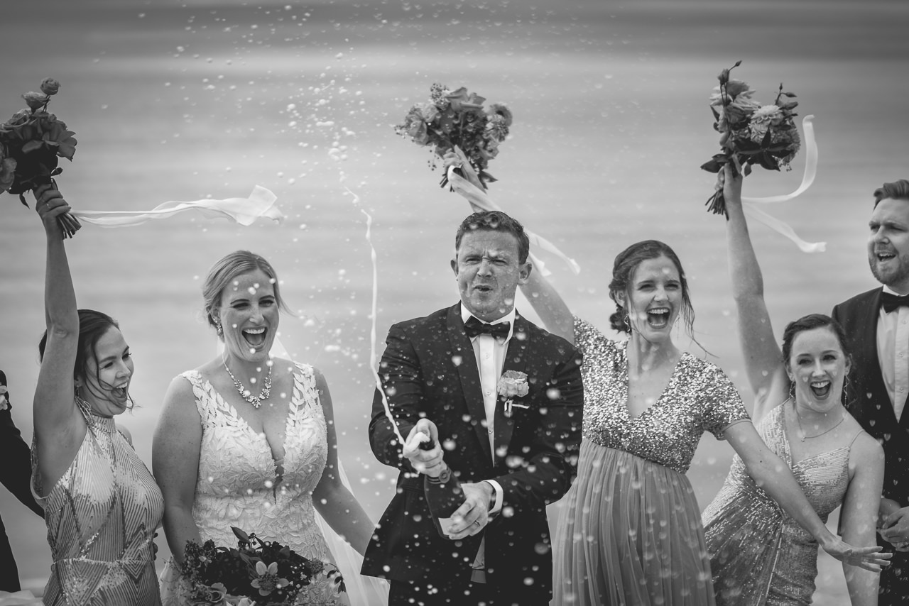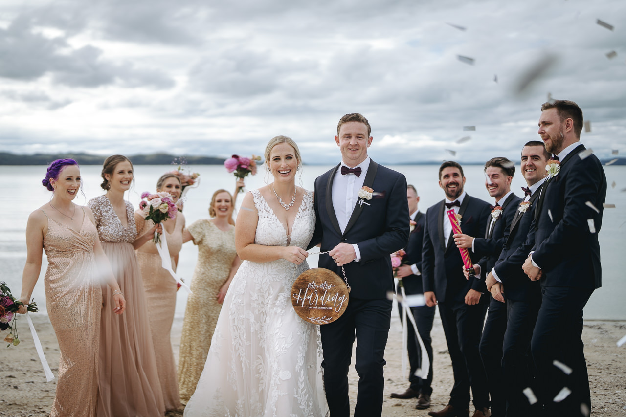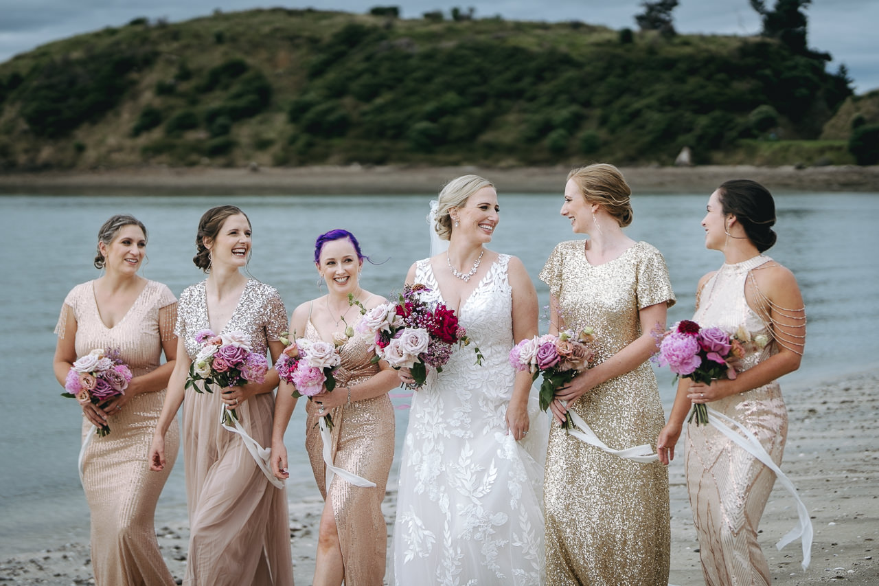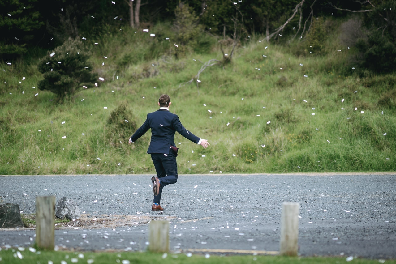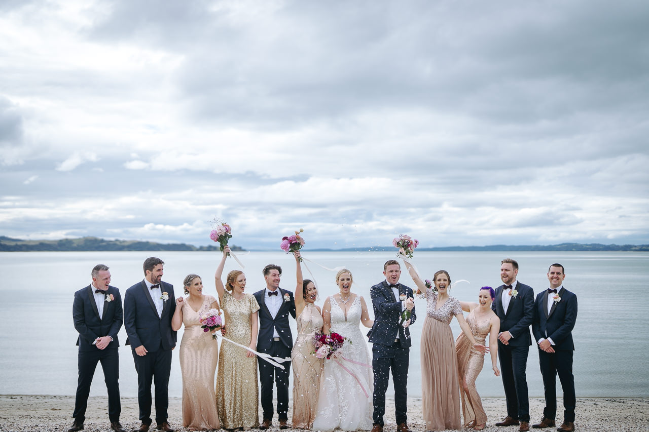 After the ceremony guests enjoyed some mingling with gorgeous views over the harbour inlet and games (including a golf driving range), while we set off to the nearby Waitawa Regional Park for bridal party and couple's photos on the little beach and a hill overlooking the Tamaki Strait and nearby islands. They pulled out all the stops for fun photos, with a champagne bottle spray and confetti cannons.