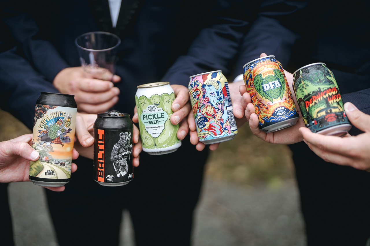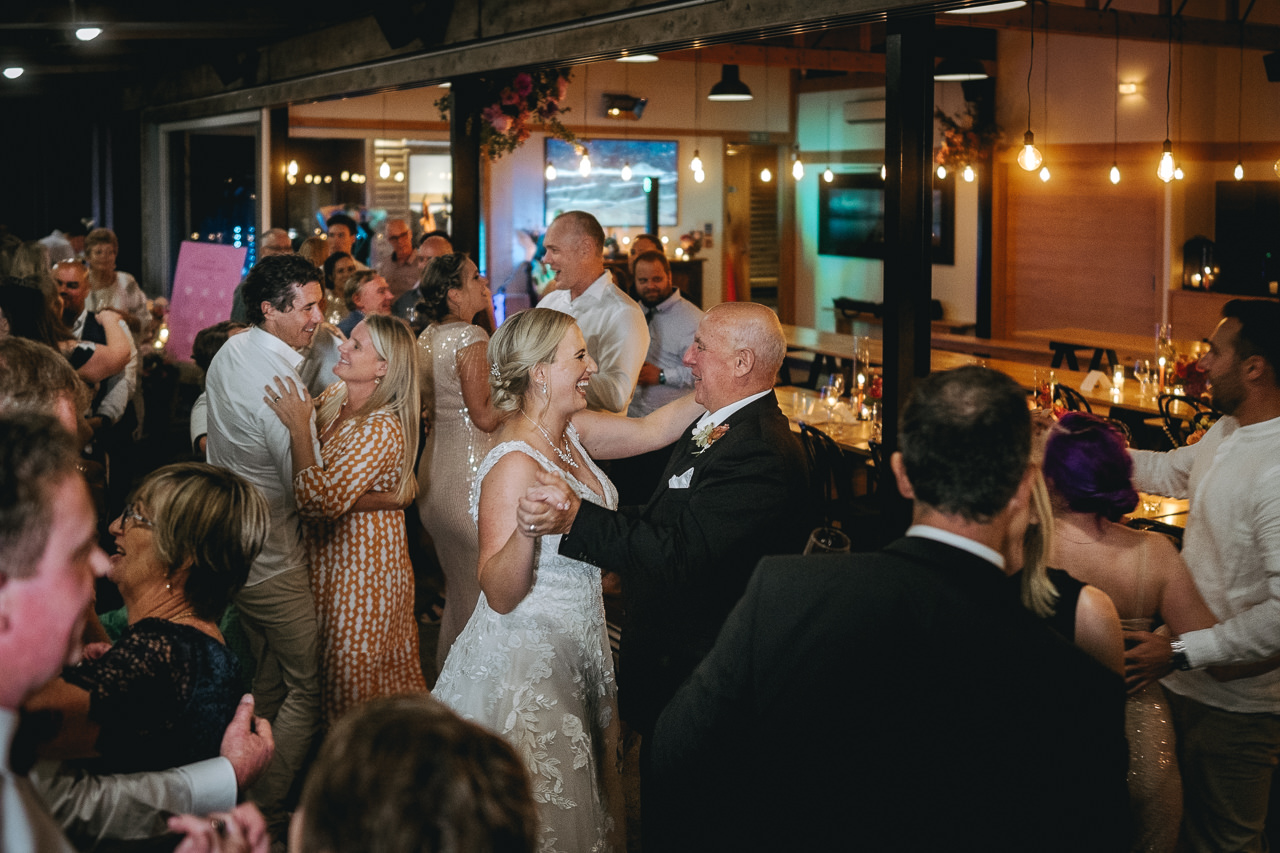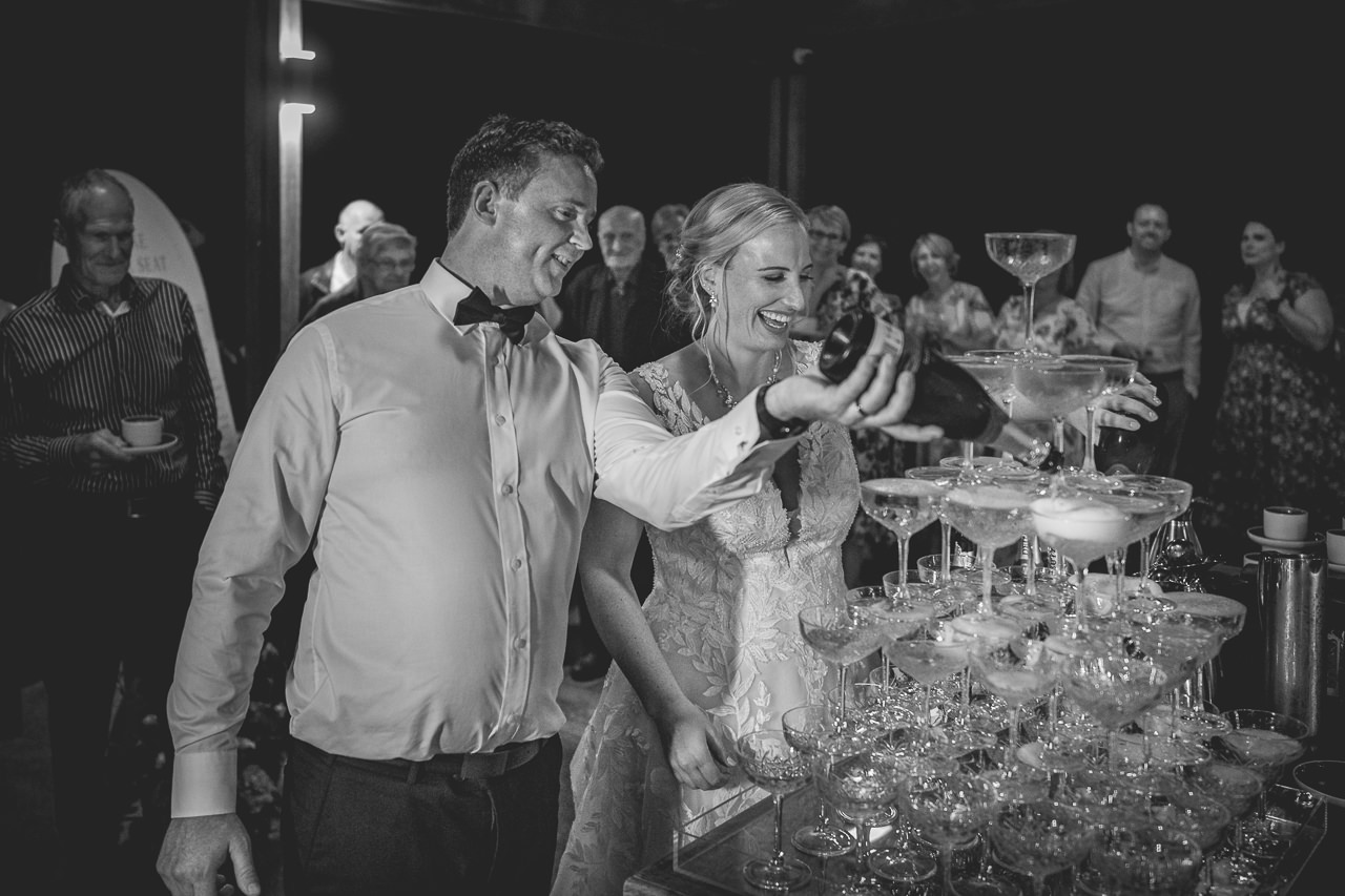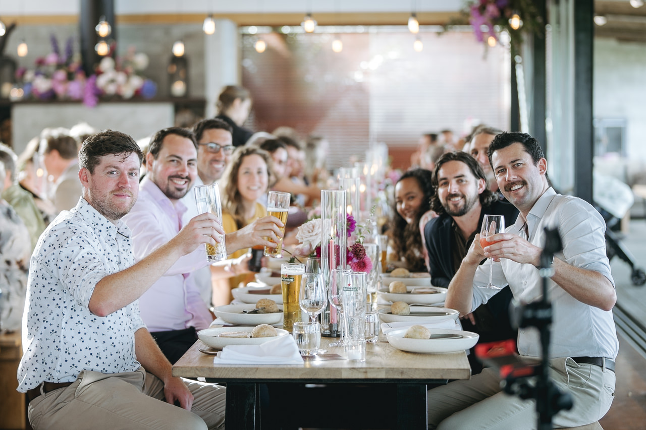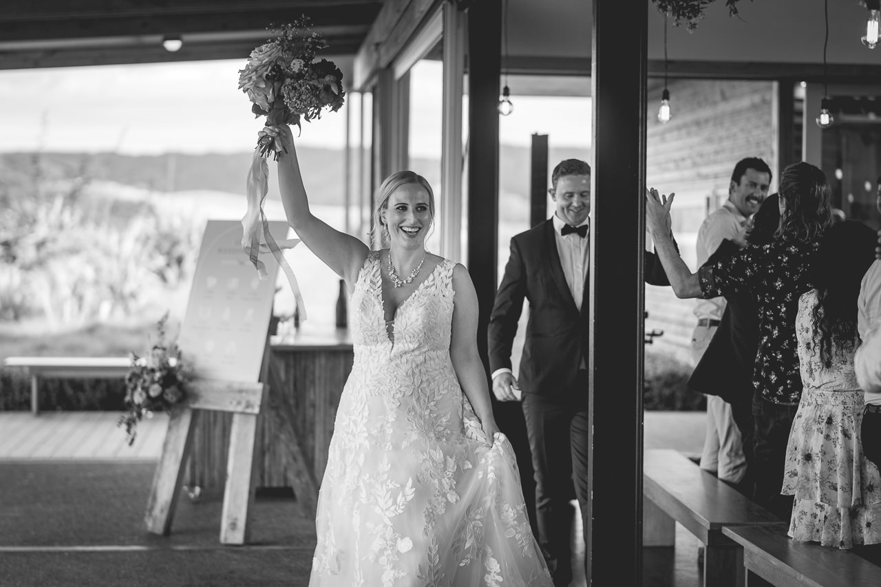 After the ceremony guests enjoyed some mingling with gorgeous views over the harbour inlet and games (including a golf driving range), while we set off to the nearby Waitawa Regional Park for bridal party and couple's photos on the little beach and a hill overlooking the Tamaki Strait and nearby islands. They pulled out all the stops for fun photos, with a champagne bottle spray and confetti cannons.