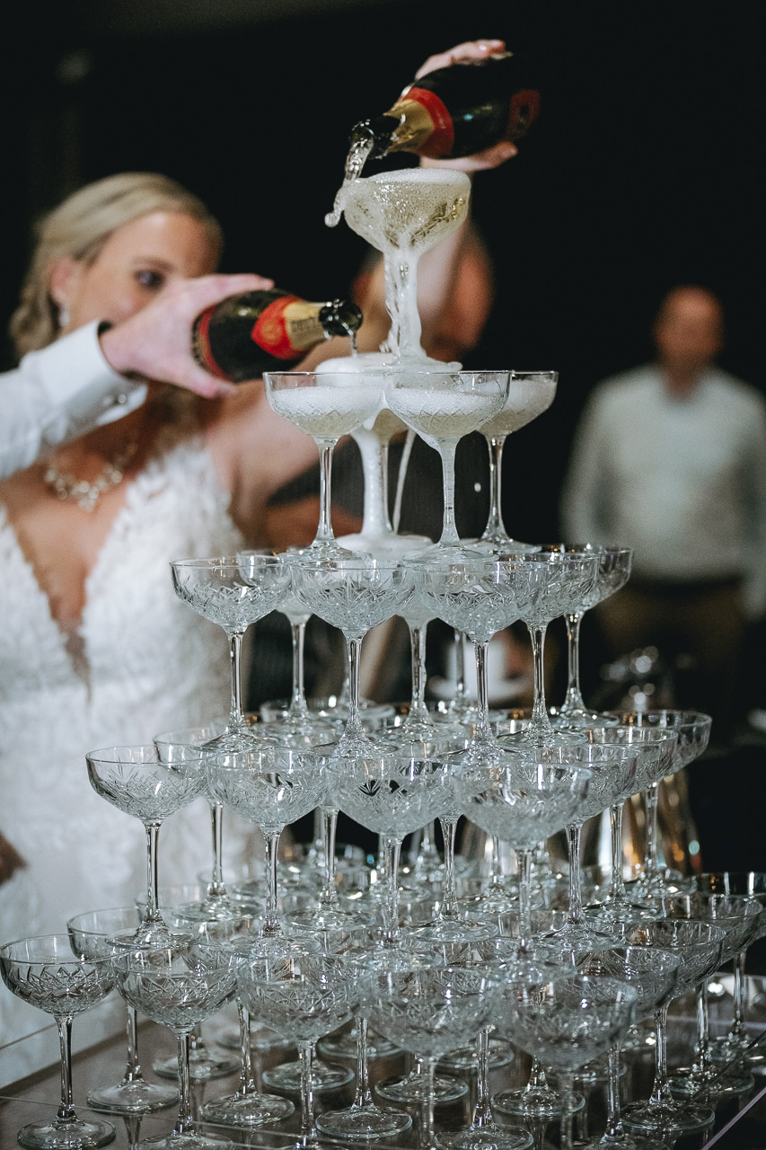 The venue was beautifully set up with amazing signage, a round arch, colourful florals, stylish table settings, a champagne glass tower and a stunning cake.
